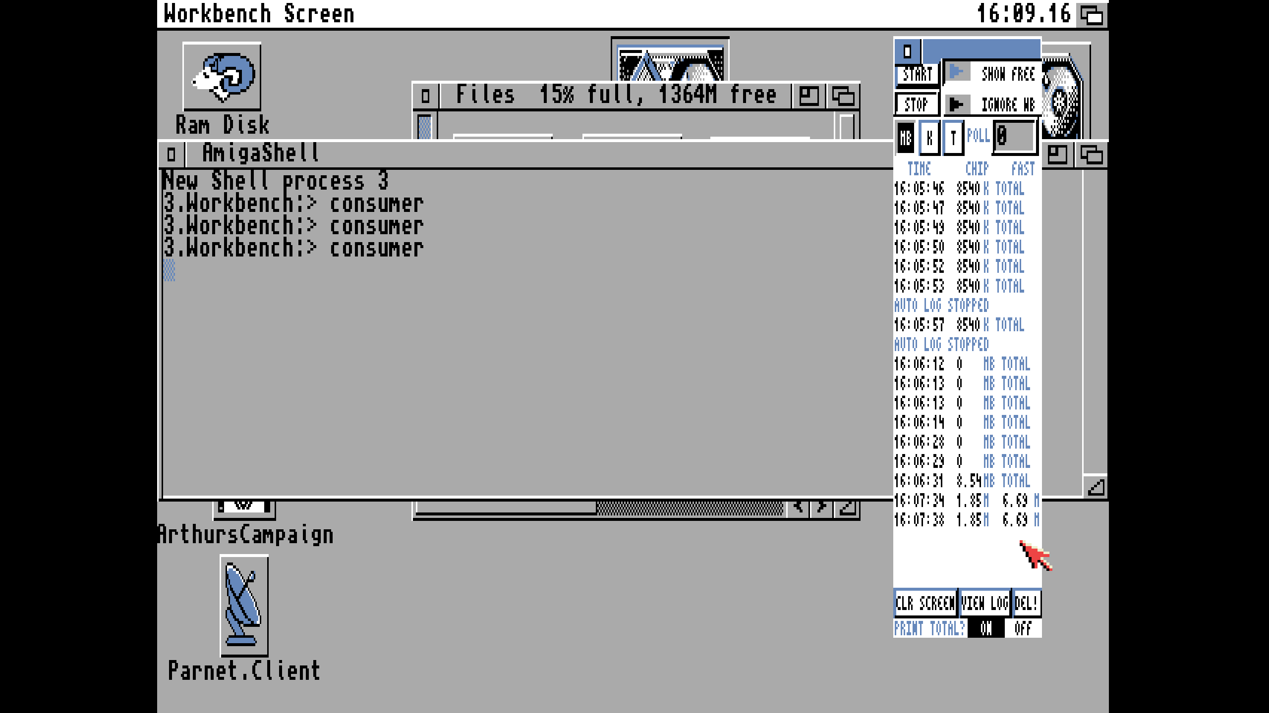 In the examples to the right: at the top is an auto log set to 2 (1 second recording) as I loaded up Alien 3 WHDLoad. Secondly is an image of a manual IgnoreWB log, as I loaded up and then shut down Directory Opus 4, and then loaded and closed Image Studio, showing Ks and MBs, and then returning to normal mode. Notice that image studio did not return all of our memory back.